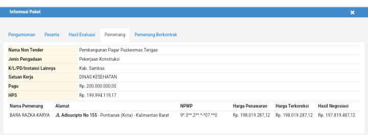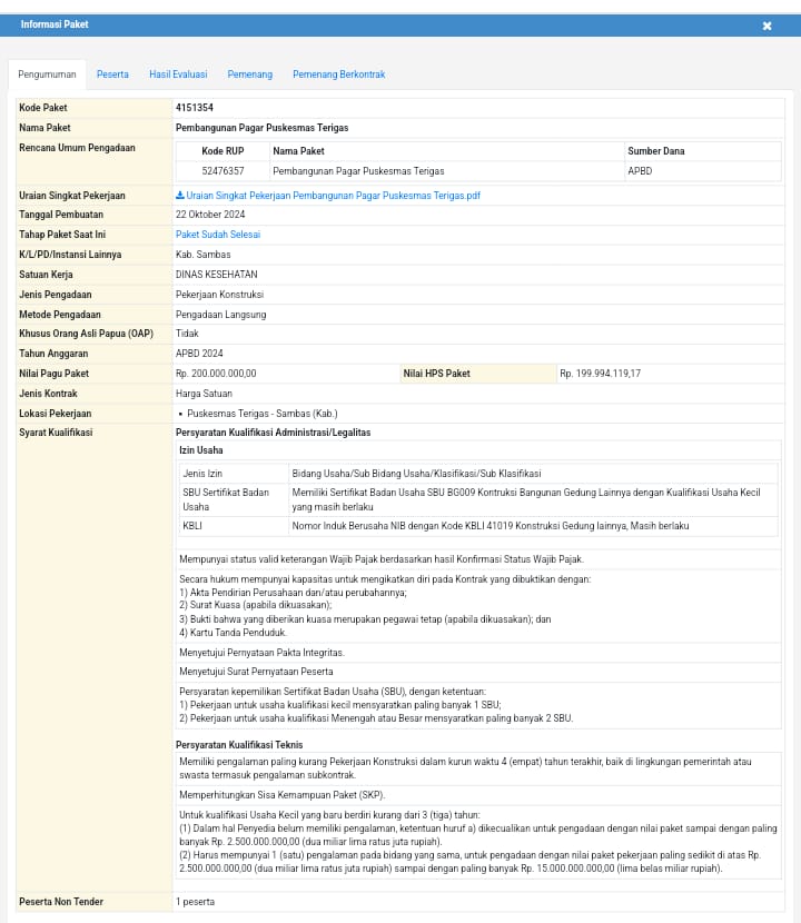 Celakanya dilokasi yang sama ada kegiatan pekerjaan Pembangunan Pagar Puskesmas Terigas, dengan nilai Rp 200 Juta, Sumber dana APBD TA 2024 Kabupaten Sambas.