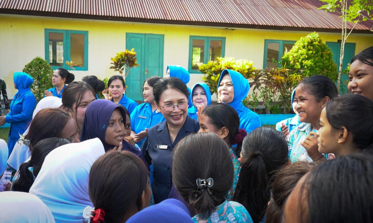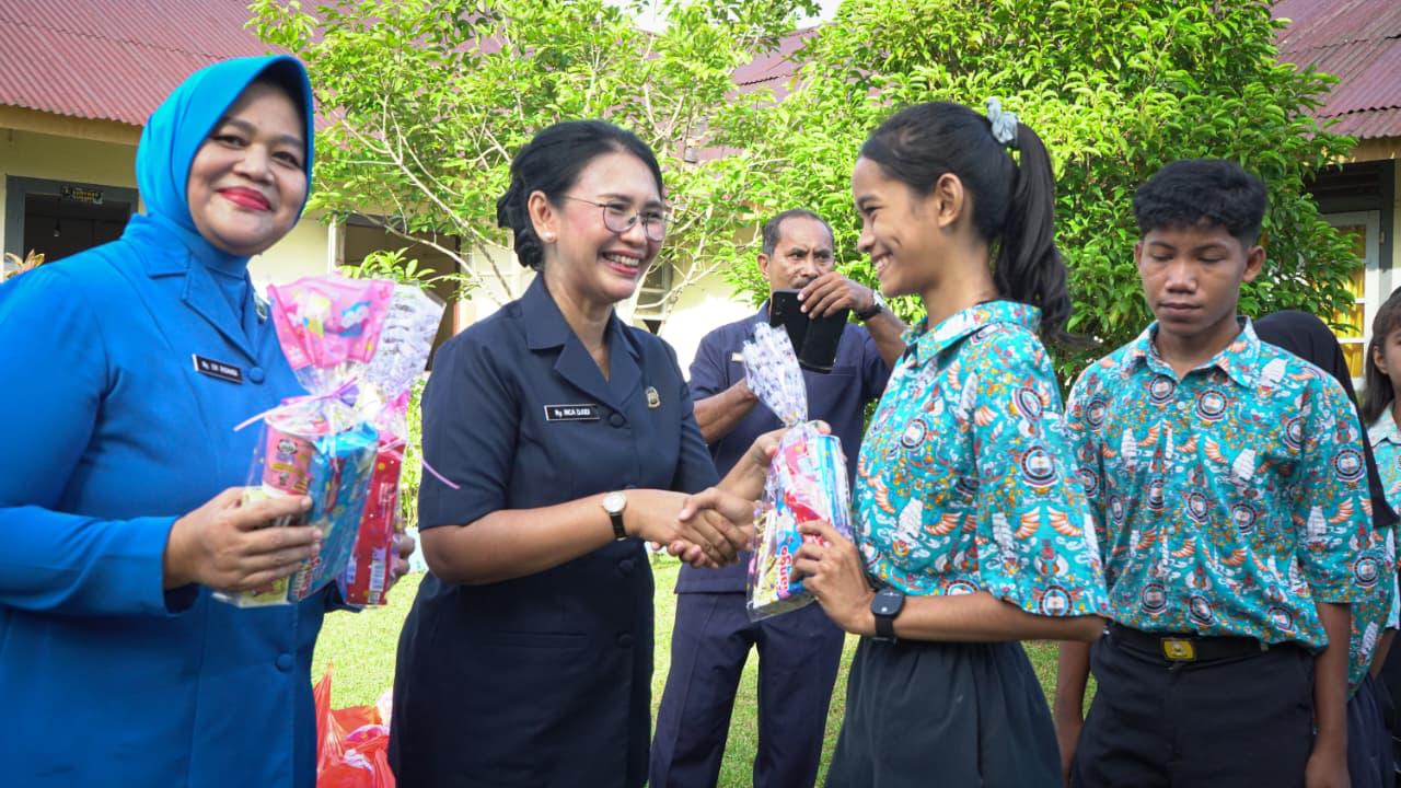 Ketua Daerah Kodaeral IX Gabungan Jalasenastri Koarmada RI, Ny. Inca Hanarko Djodi Pamungkas memberi kejutan bingkisan bagi siswa dan guru disela acara peringati Hari Ulang Tahun ke-79 Yayasan Hang Tuah Tahun 2026 yang digelar di Lapangan Upacara SMP Hang Tuah Mako Kodaeral IX pada Rabu (14/1/2026).