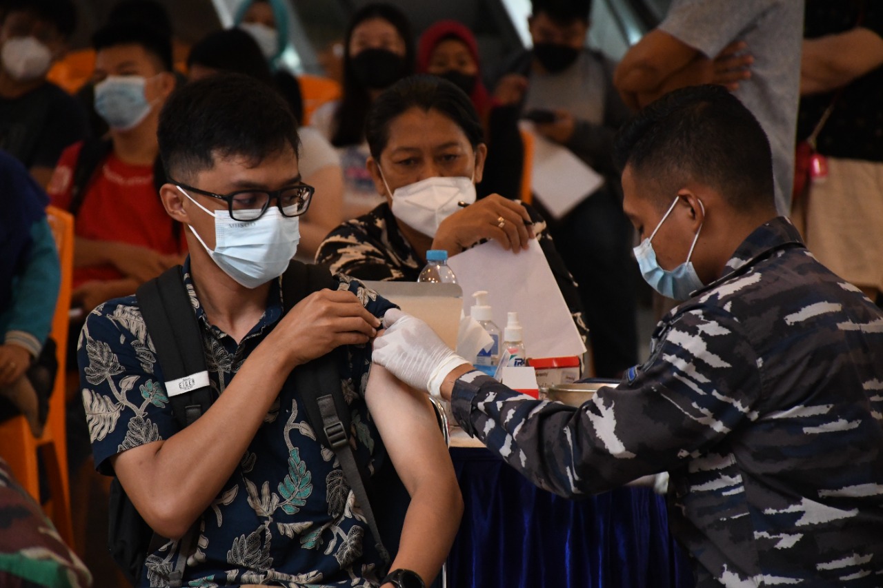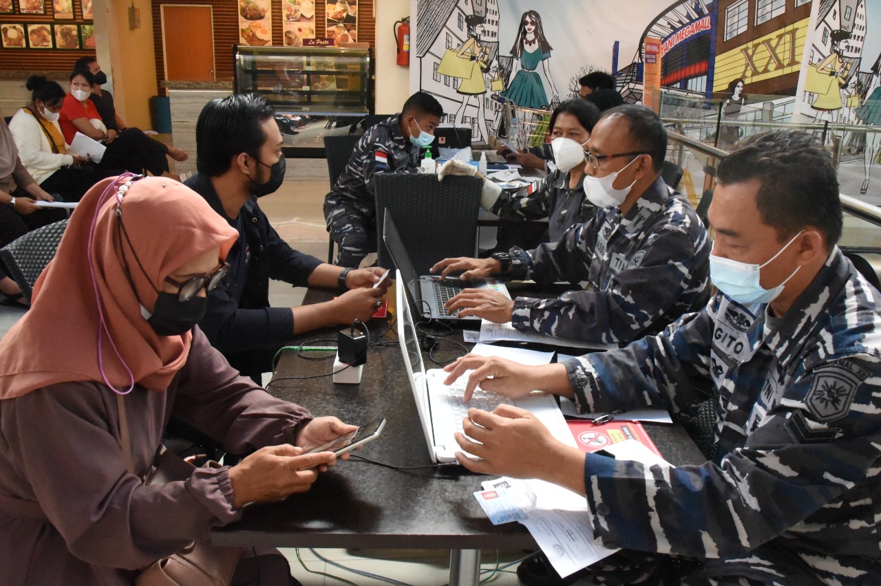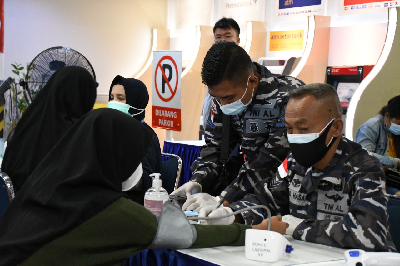 Menindaklanjuti perintah Komandan Lantamal XII Pontianak Brigjen TNI (Mar) Andi Rukman, Jumat (27/08/2021), kembali Kepala Dinas Kesehatan Lantamal XII, Letkol Laut (K) drg. Heru Subagyo, Sp. Pros. selaku Dansatgas Penanggulangan Covid-19, menurunkan 1 Tim Vaksinator Diskes Lantamal XII bersinergi dengan Tim Vaksinator Gabungan dari Dinkes Prov. Kalimantan Barat, Unsur TNI/Polri dalam rangka Serbuan Vaksinasi terhadap Masyarakat Kota Pontianak di A. Yani Megamal yang berada di Jln. Jenderal Ahmad Yani No.4, Parit Tokaya, Kec. Pontianak Selatan, Kota Pontianak, Kalimantan Barat.