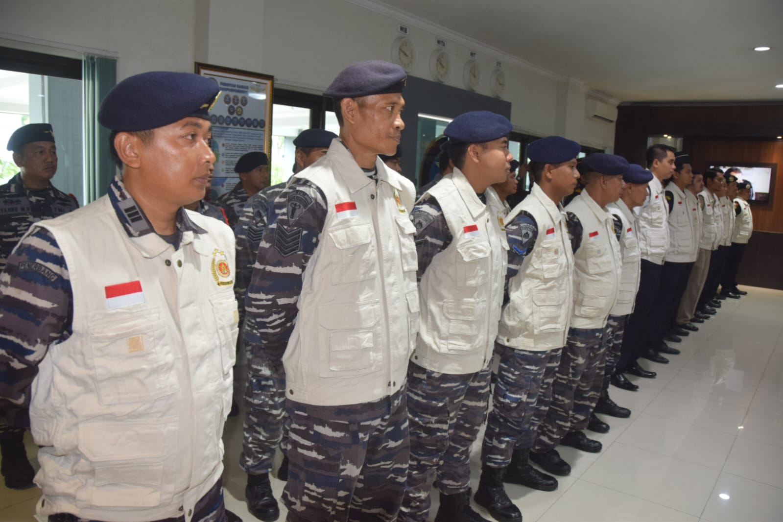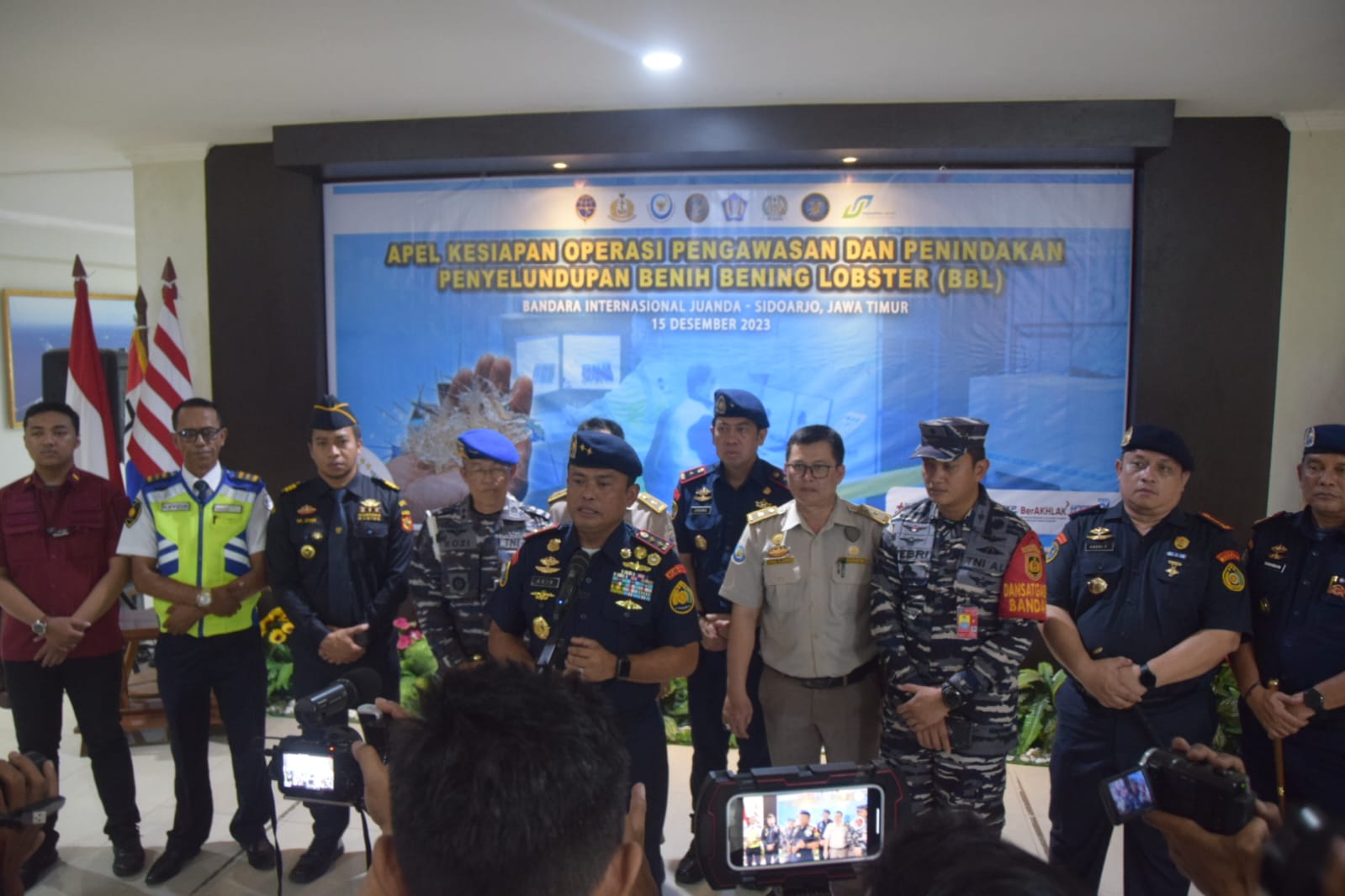 Satuan Tugas Pengamanan Pangkalan Udara TNl AL (Lanudal) Juanda Puspenerbal, menggelar Apel Kesiapan Operasi Bersama Pengawasan dan Penindakan Penyelundupan Benih Bening Lobster (BBL) di Bandara Internasional Juanda yang dihelat di Markas Komando Lanudal Juanda, Puspenerbal, Jumat (15/12/2023).