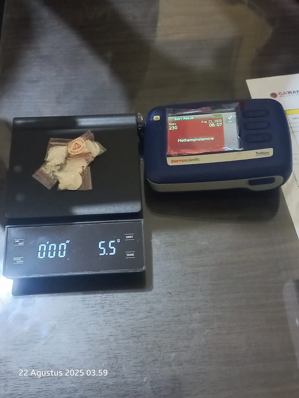 Setelah dilakukan uji menggunakan TruNarc Handled Narcotics Analyzer lanjut Rei, barang tersebut dipastikan positif mengandung methamphetamine dan ganja.