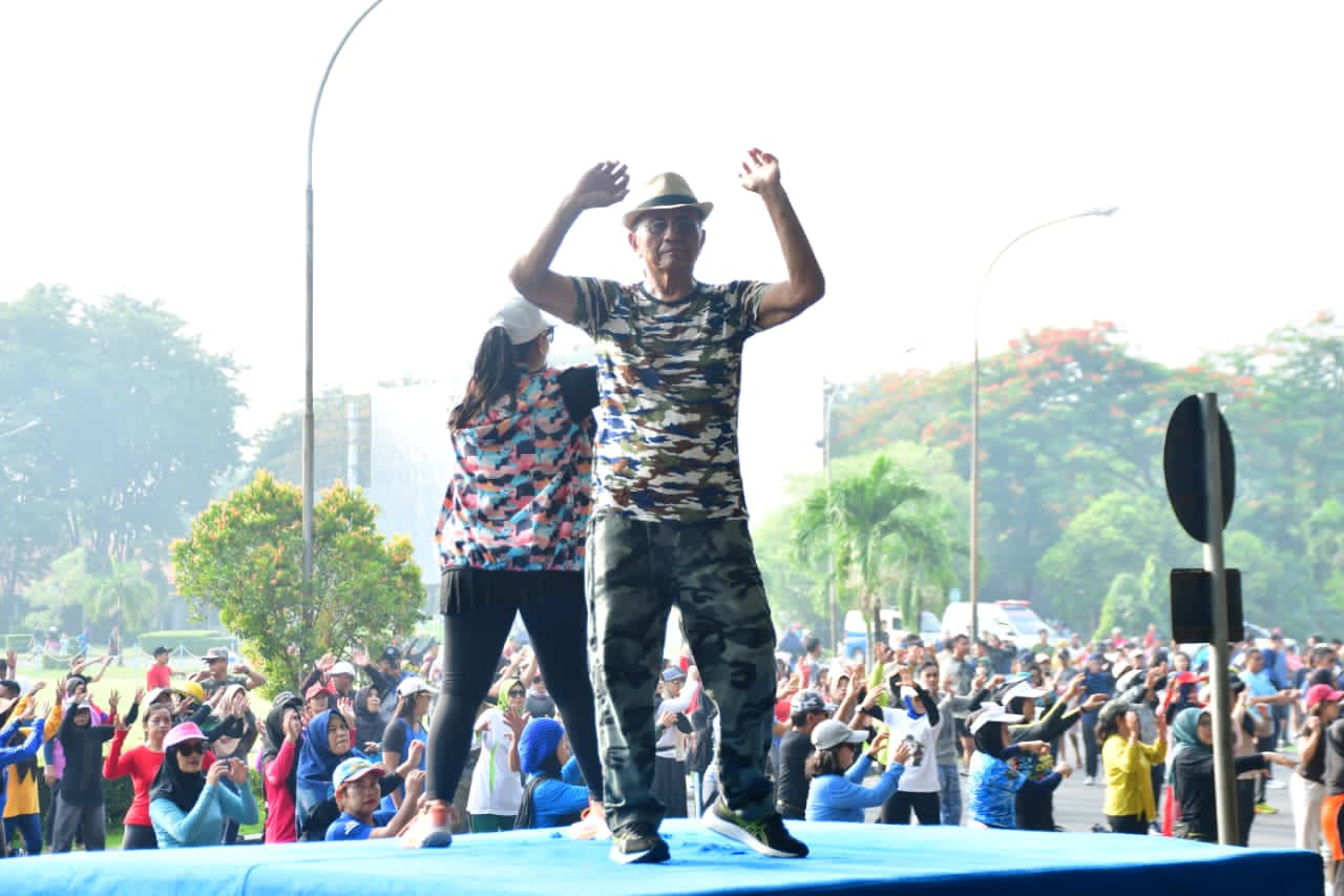 Sejak pukul 06.00 hingga 07.00 wib, Dahlan Iskan berada diatas panggung bersama satu instruktur senam, memimpin senam dengan iringan irama musik asik menghentak.