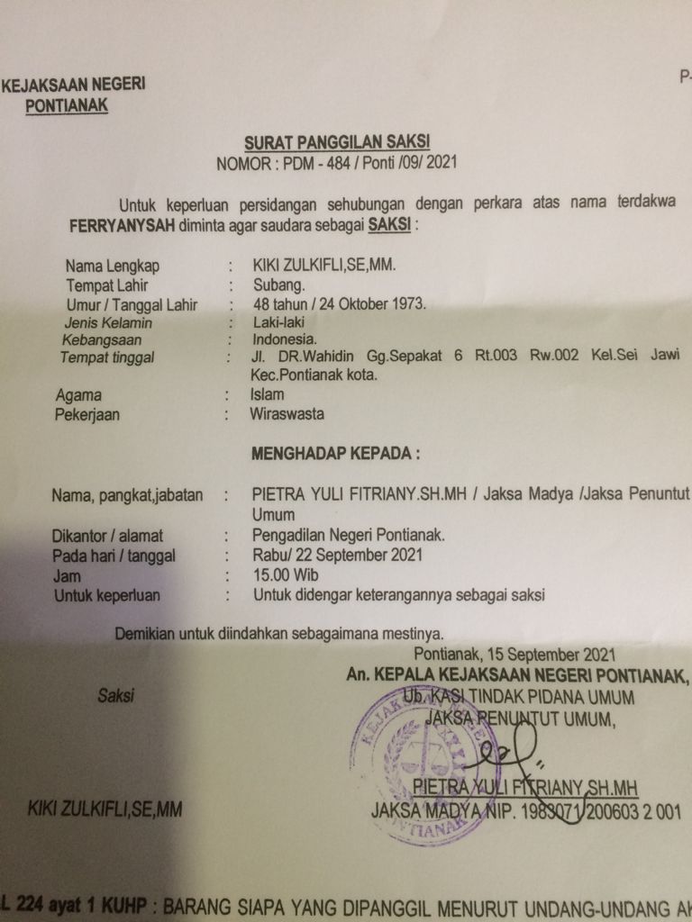 Perkembangan terakhir dari Proses hukum atas Perbuatan Penipuan modus Proyek POKIR Dewan yang dilakukan oleh Feryansyah yang digelar di PN Pontianak Hari Rabu (23/09/21) dengan Menghadirkan Kiki sebagai Saksi Korban.