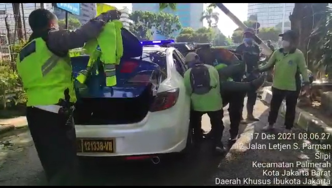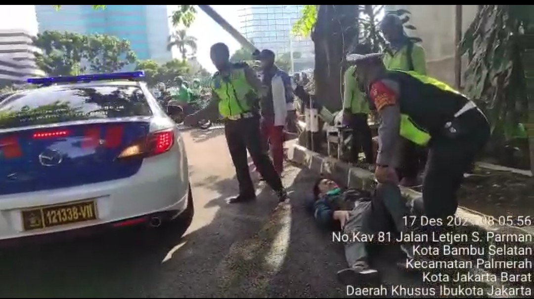 Wujud kesigapan polisi lalu lintas Jakarta Barat kembali ditunjukkan oleh personel unit Turjawali Satlantas Jakarta Barat yang membantu masyarakat yang mengalami kecelakaan di autren slipi depan komplek Bank Mandiri jl S Parman Slipi Jakarta Barat, Jumat, 17/12/2021.