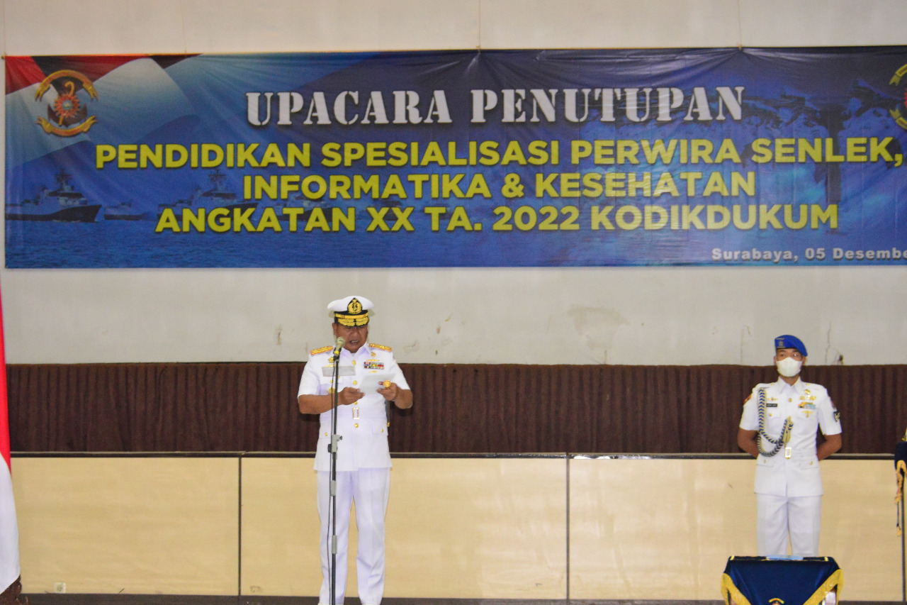 Sebanyak 58 siswa Pendidikan Spesialisasi Perwira (Dikspespa) TNI AL TA 2022 selesai mengikuti pendidikan di Komando Pendidikan Dukungan Umum (Kodikdukum) Komando Pembinaan Doktrin Pendidikan dan Latihan Angkatan Laut (Kodiklatal). Adapun penutupan pendidikan tersebut dipimpin langsung Dankodikdukum Laksamana Pertama TNI Budi Raharjo di gedung R.E. Martadinata, Kodiklatal, Bumimoro Surabaya, Senin, (5/12).