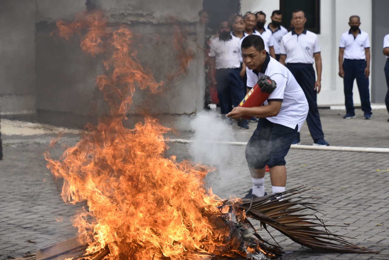 Dalam rangka bulan Trisila, Antap STTAL melaksanakan simulasi peran pemadaman kebakaran berlangsung di depan Gedung Direktorat Vokasi STTAL Bumimoro Surabaya, Rabu (15/8/2022).
