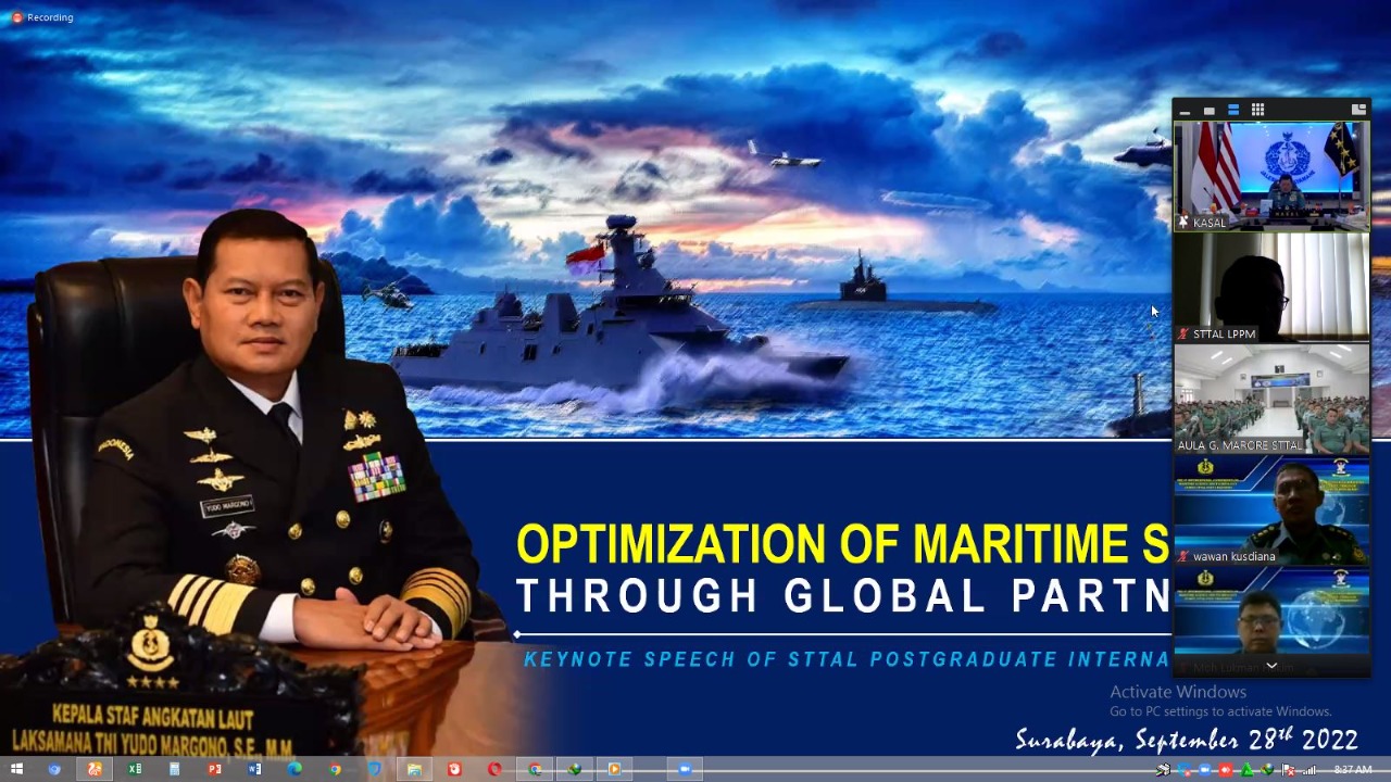 Seminar internasional dengan tema “Optimalization of Maritime Security Through Global Partnership” dibuka oleh Komandan STTAL Laksma TNI Dr. Mukhlis, S.T., M.M. dengan menghadirkan keynote speaker, Kepala Staf Angkatan Laut, Laksamana TNI Yudo Margono, S.E., M.M. Hadir dalam kegiatan tersebut sebagai peserta seminar kurang lebih 396 orang, terdiri dari: para pejabat Kotama TNI AL, para akademisi dan peneliti dari berbagai perguruan tinggi Negeri/Swasta, dosen dan mahasiswa STTAL.