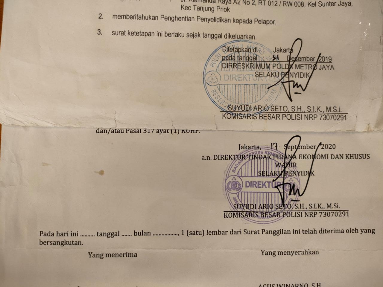 Berdasarkan surat nomor:B/3505/VII/ReS.7.5/2020/Bareskrim Mabes Polri dan Surat Pemberitahuan Perkembangan Hasil Penyidikan Perkara (SP2HP2)tanggal 7 Juli 2020.