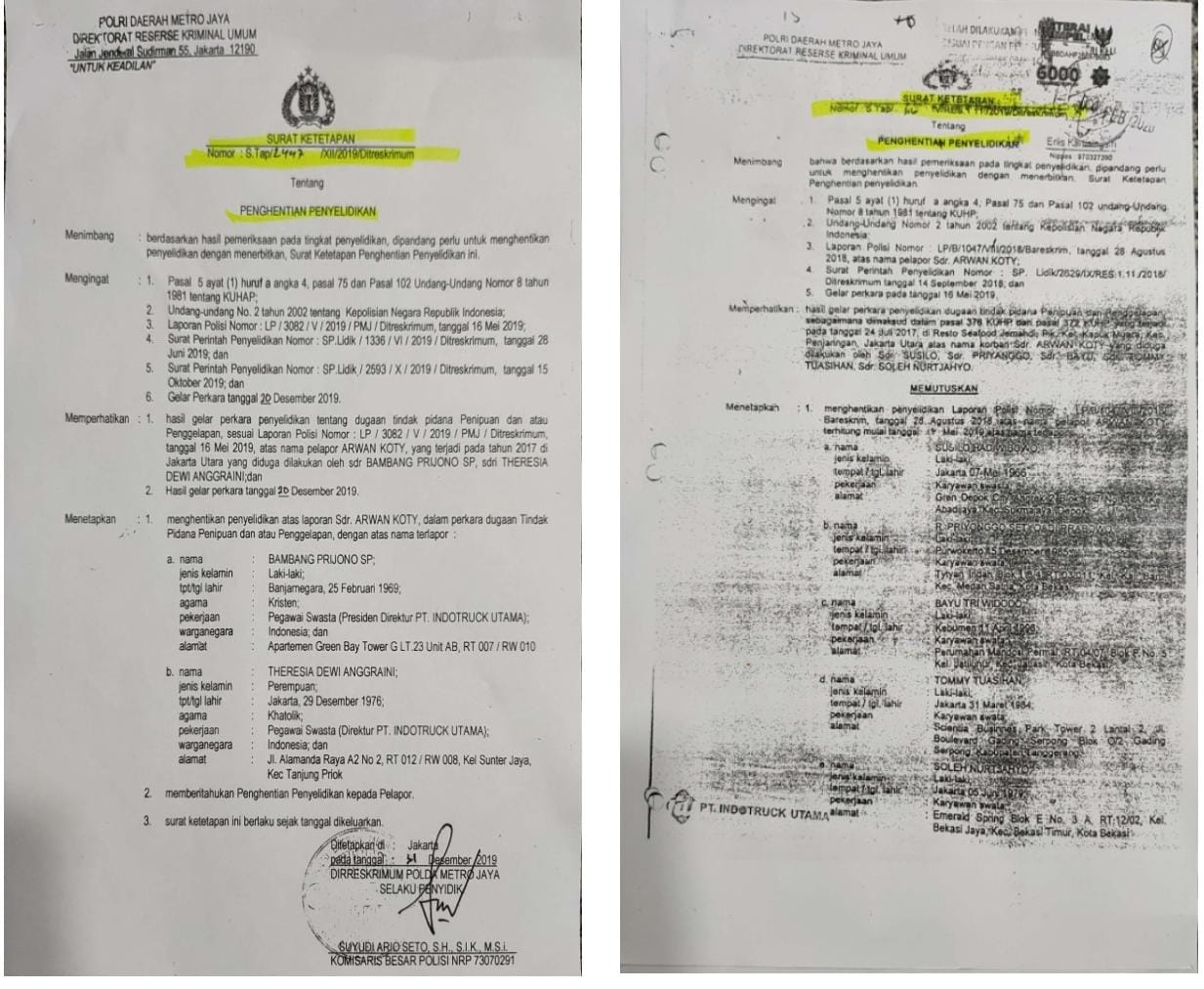 Pada tanggal 16 Mei 2019 lalu, Arwan Koty membuat laporan di Polda Metro Jaya dengan Nomor LP/3082/V / 2019 / PMJ /Dit.Reskrimum sehubungan dugaan tindak pidana penipuan dan atau penggelapan yang diduga dilakukan oleh Bambang Prijono dan Theresia Dewi Anggraeni dari PT.Indotruck Utama, Yang proses penyelidikannya ditangani oleh Subdit 4 Jatanras Polda Metro Jaya.
