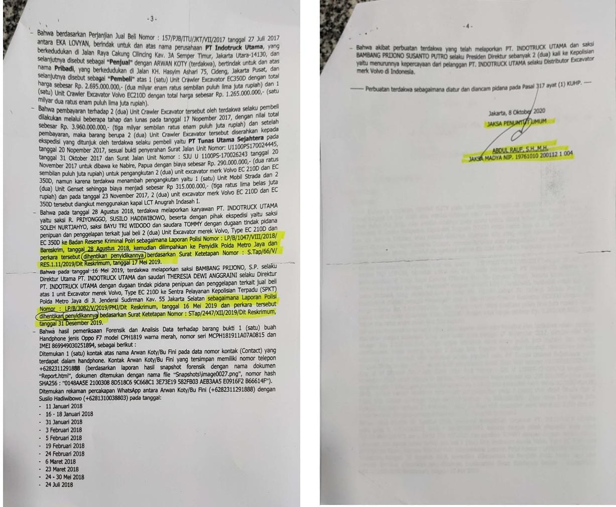 Laporan Polisi No.LP/3082/V/2019/PMJ/Dit. Reskrimum didalam uraian singkat kejadian, Bahwa keterangan Arwan Koty (pelapor) Bahwa pelapor memesan 1 unit Excavator type EC 210D, Dikuatkan dengan adanya Perjanjian Jual Beli (PJB) No. 157 /PJB / ITU / JKT / VII / 2017 tanggal 27 Juli 2017. Yang telah dibayar lunas