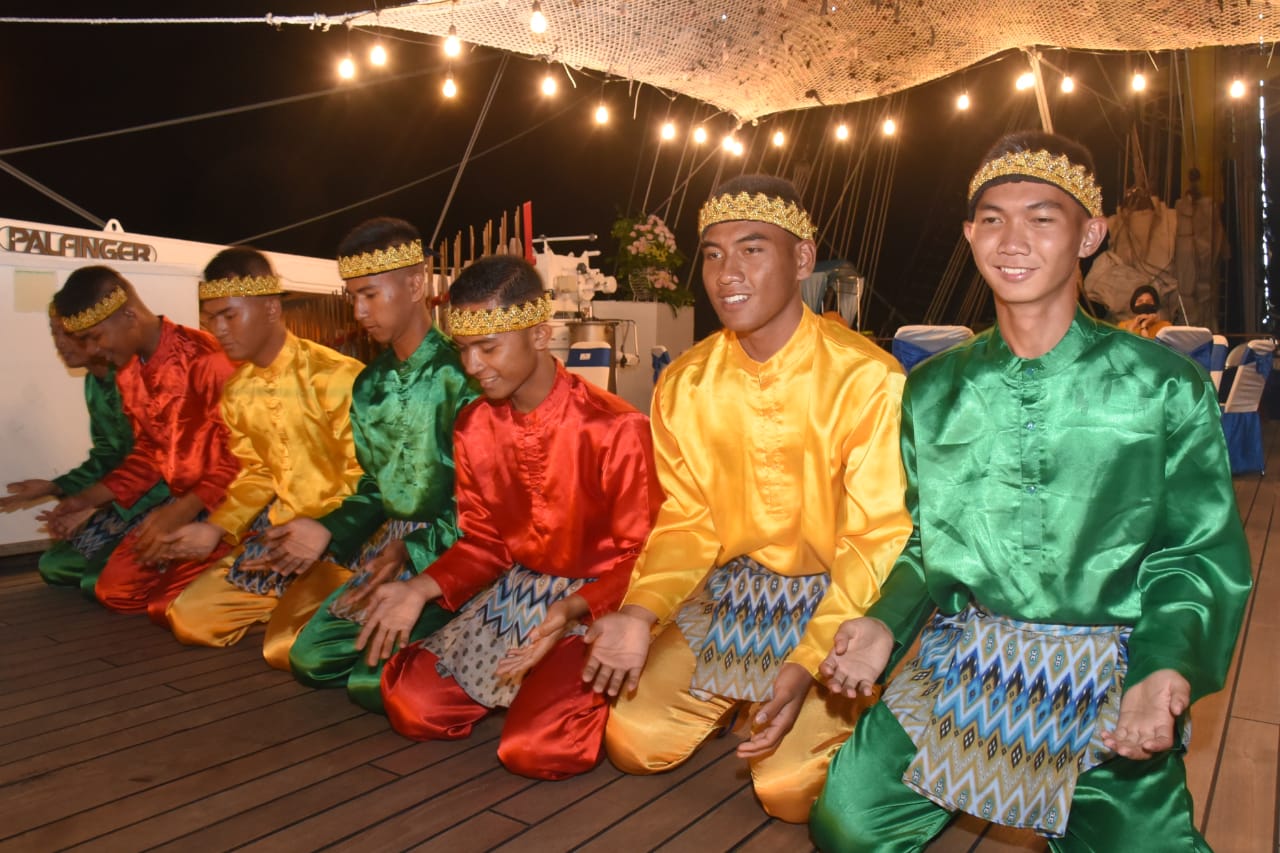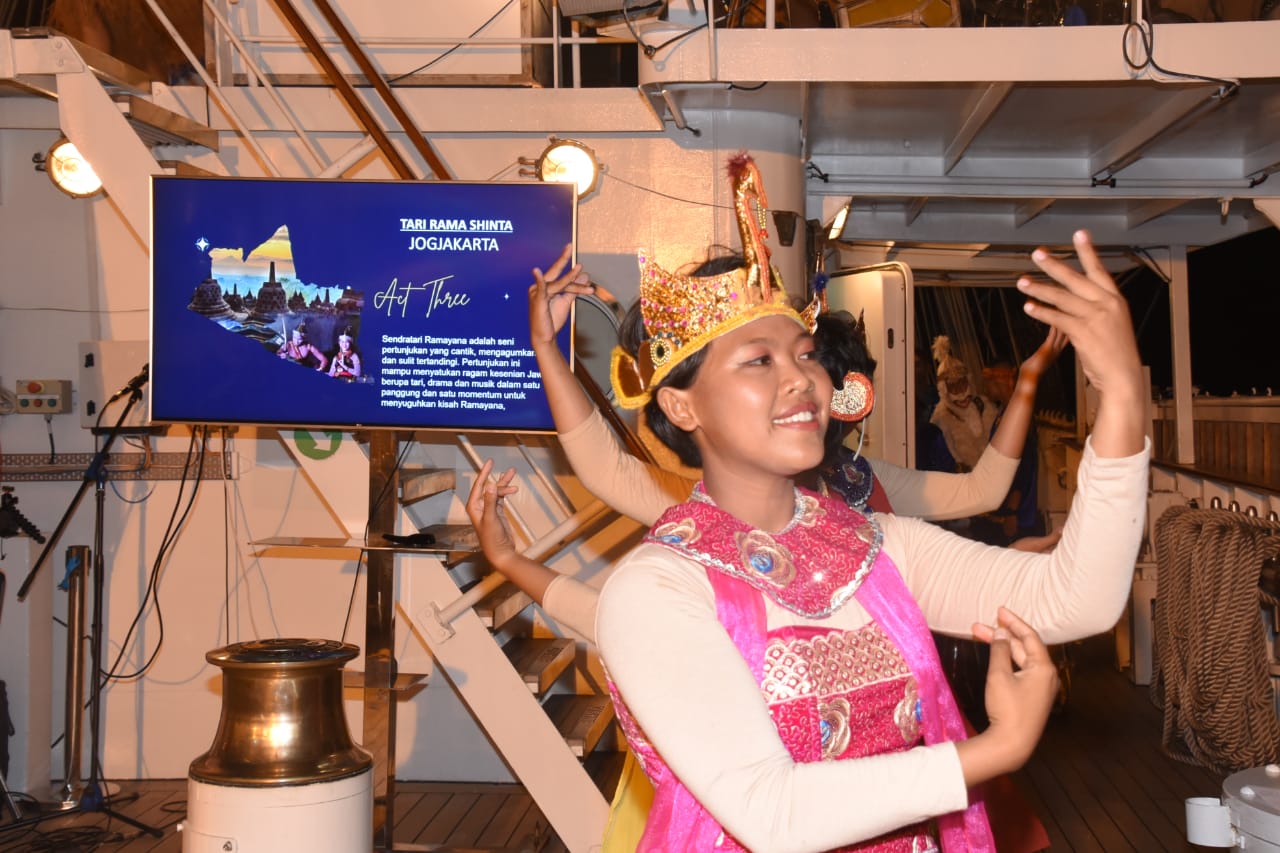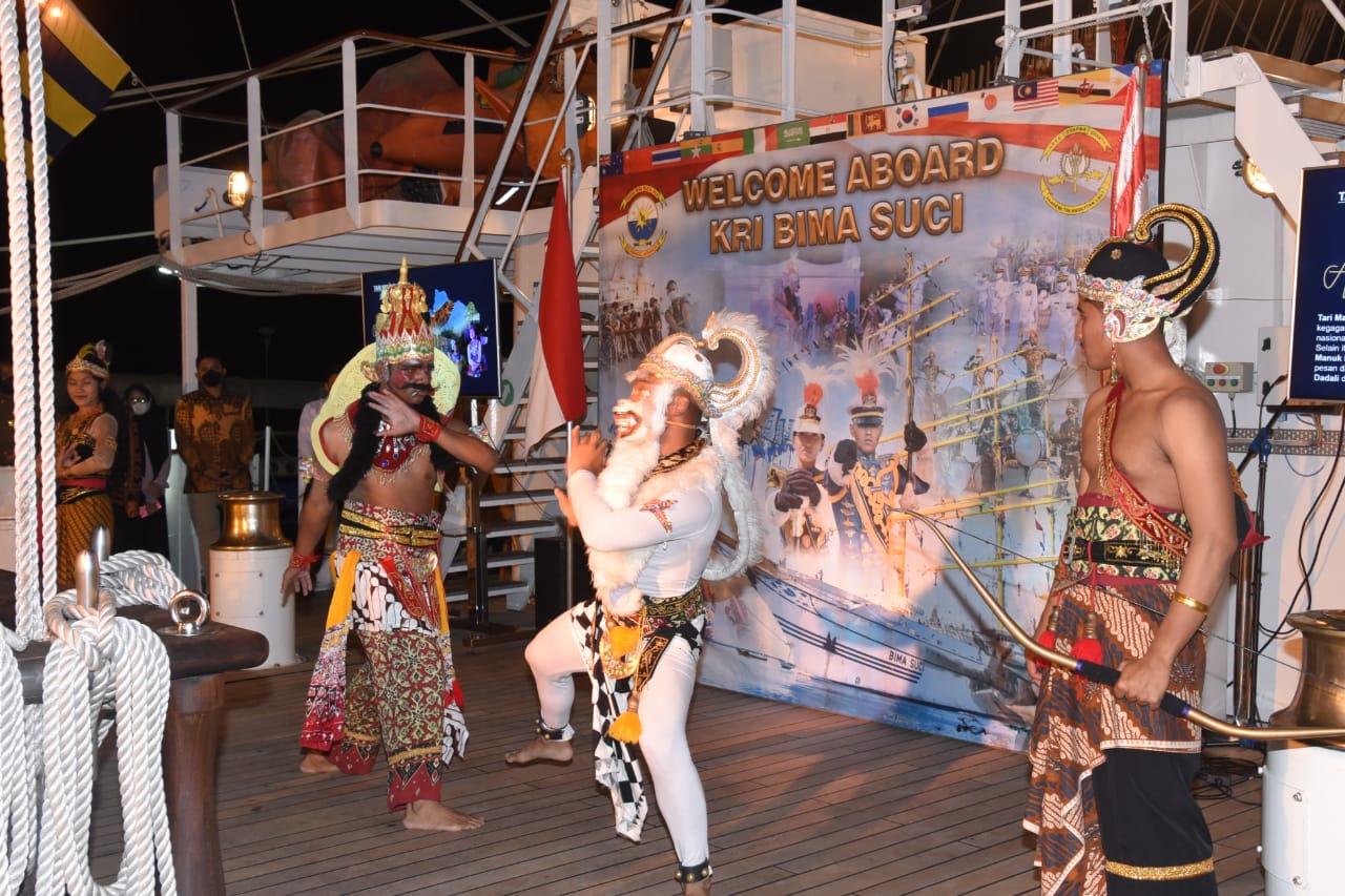 Tarian Nusantara yang dimainkan Taruna Akademi Angkatan Laut (AAL) Tingkat lll Angkatan ke-68, Satuan Latihan Kartika Jala Krida (Satlat KJK) 2021, melengkapi suguhan acara Cocktail Party yang digelar di atas geladak KRI Bima Suci yang sedang singgah di dermaga VI Pelabuhan Tanjung Intan Pelindo, Cilacap, tadi malam.