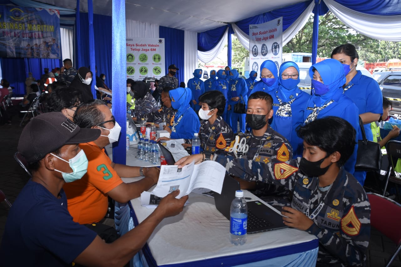Guna memaksimalkan program Serbuan Vaksinasi Maritim TNI AL ini, diterjunkan puluhan tenaga vaksinator dari Balai Kesehatan Lanal Cilacap, PT SBI dan dari kesehatan Satgas KJK 2021 yang dibantu oleh Taruna AAL.