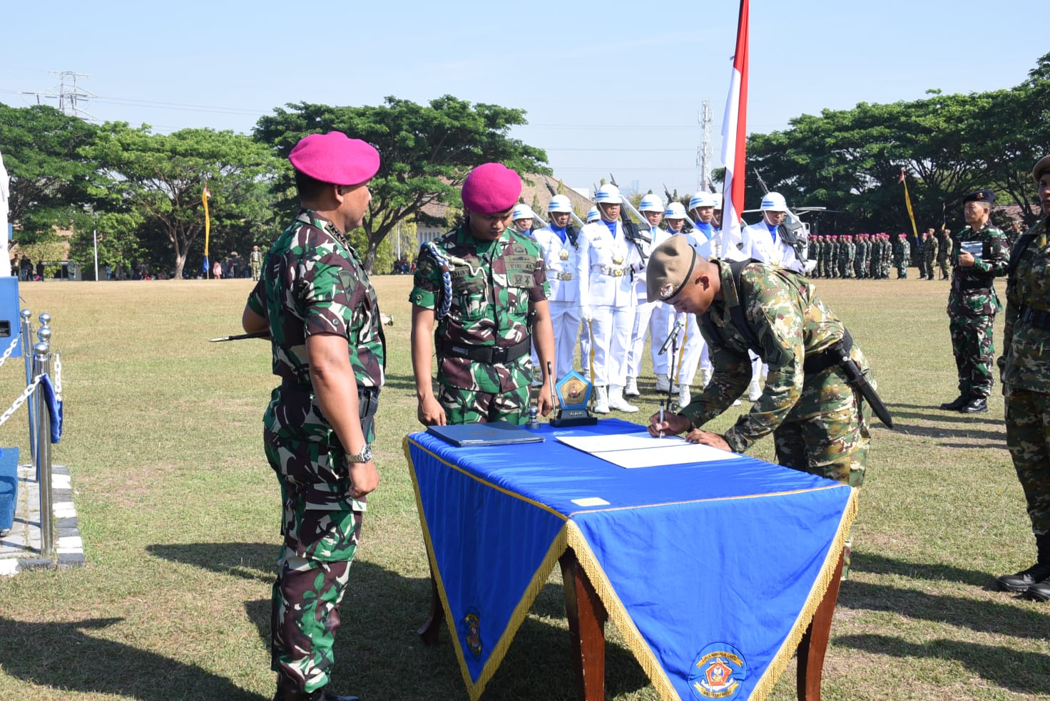 Komandan Komando Pembinaan Doktrin Pendidikan dan Latihan TNI Angkatan Laut (Dankodiklatal) Letnan Jenderal TNI Marinir Suhartono, resmi menutup Pendidikan Latihan Dasar Militer (Diklatsarmil) Komponen Cadangan (Komcad) Matra Laut Tahun 2023 di Lapangan Ewa Pangalila Mako Komando Pendidikan Marinir (Kodikmar) Gunung Sari Surabaya, Senin (31/7/2023).