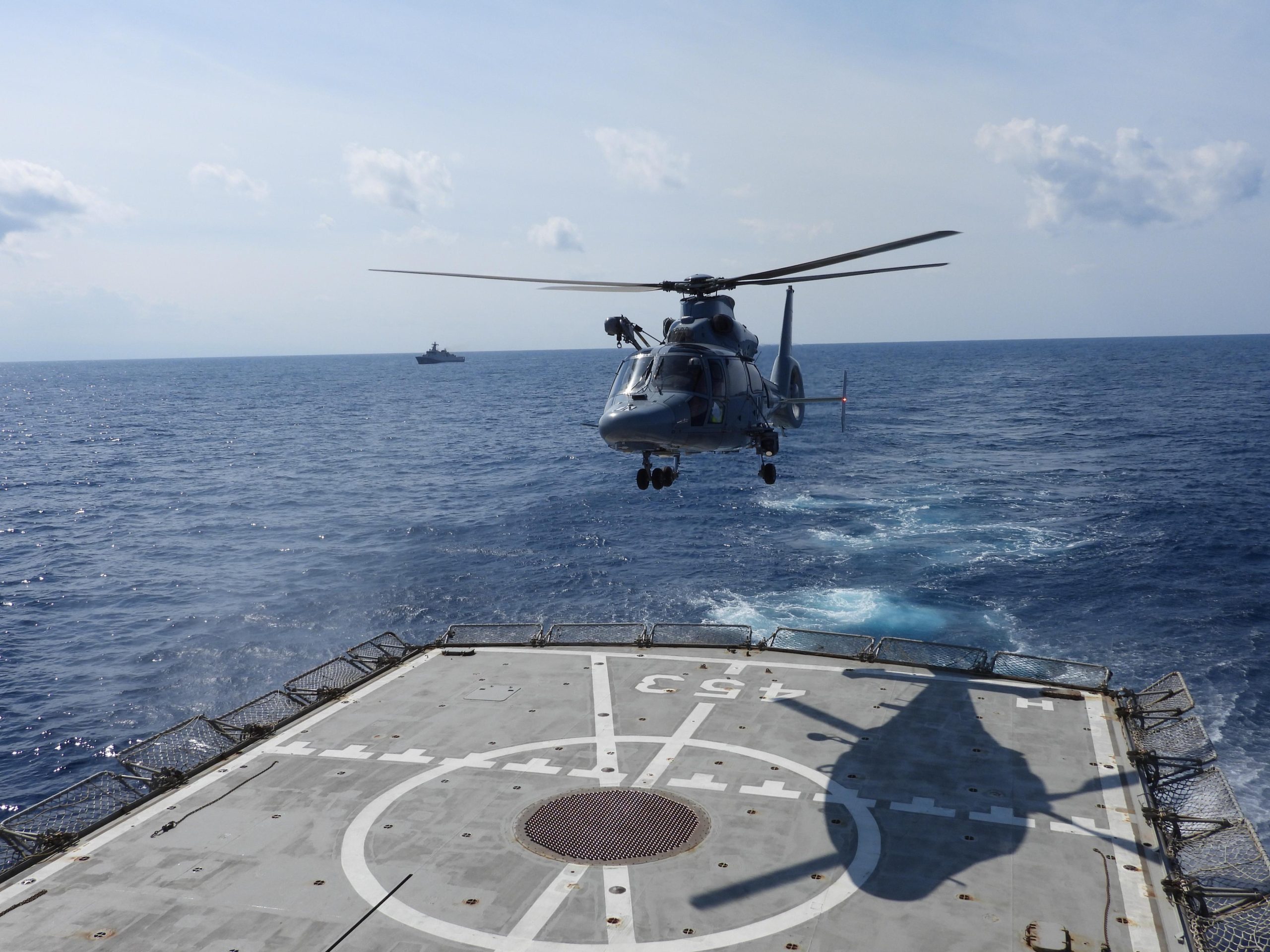 Heli HS-1305 yang diawaki Kapten Laut (P) Rayendra Jaka selaku Captain Pilot dan Lettu Laut (P/W) Michelle selaku Copilot, Heli take off dari KRI Diponegoro-365 untuk selanjutnya melaksanakan Photo Exercise formasi antara dua kapal perang tersebut.