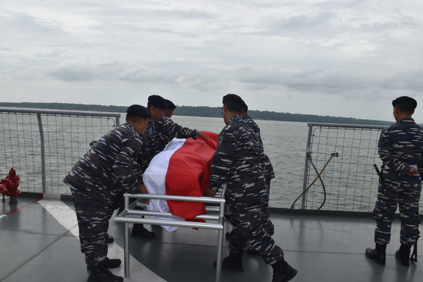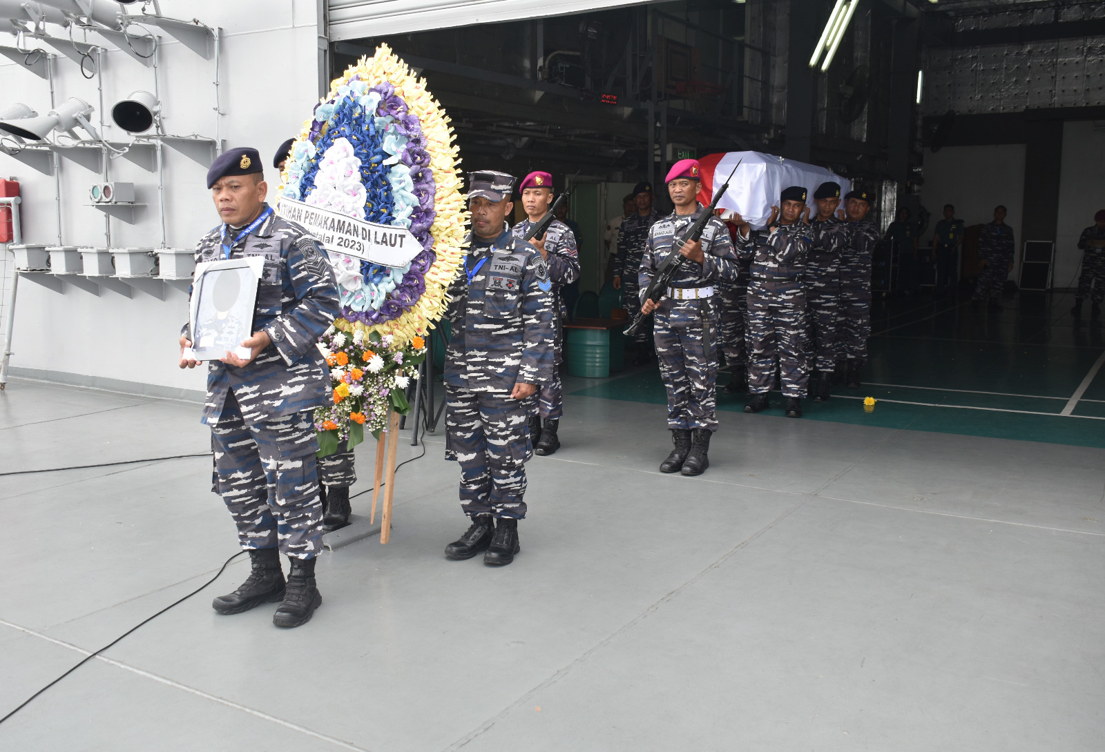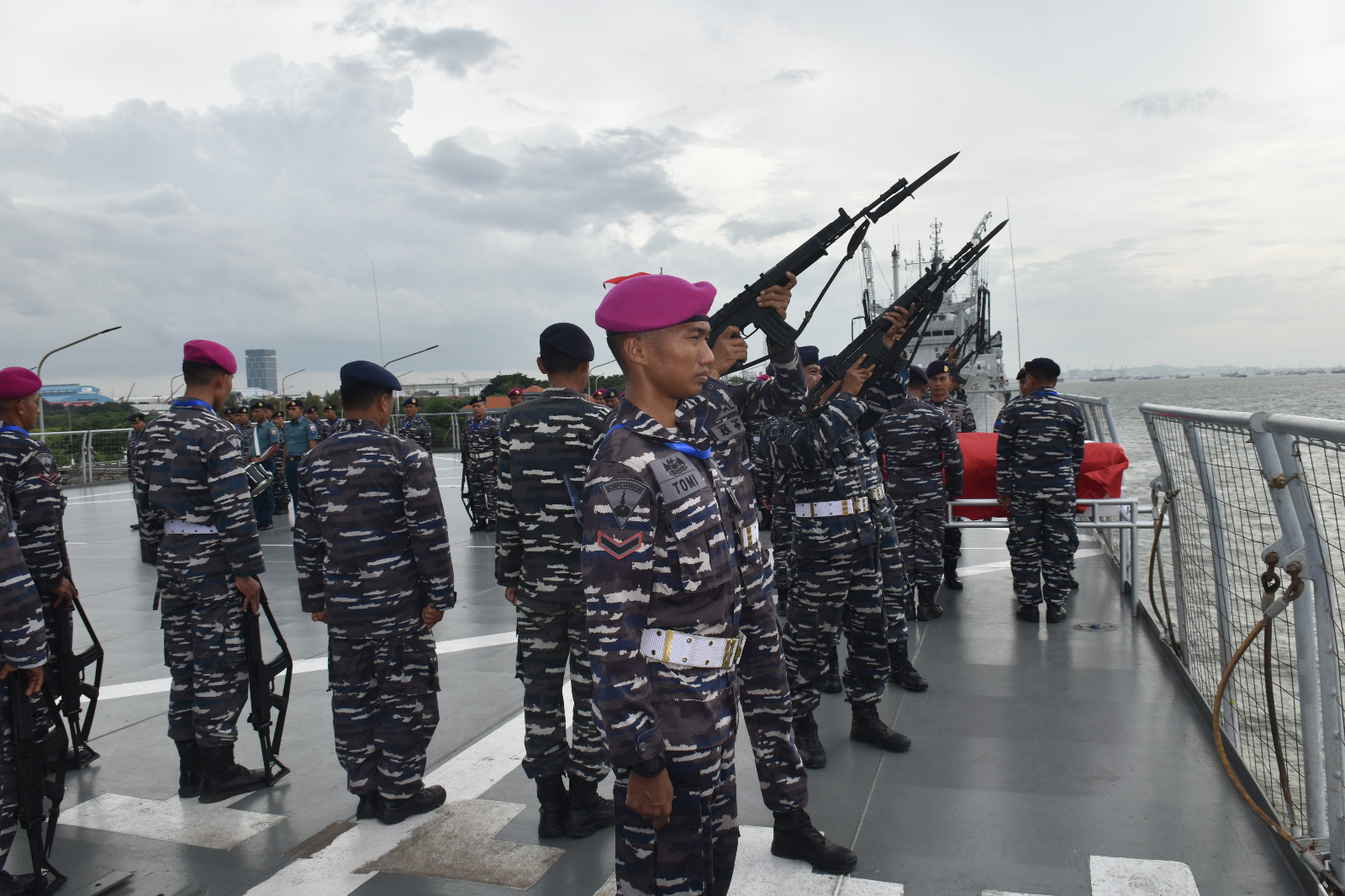Hari ketiga pelaksanaan Program Pembinaan Mental Terpadu tahun 2023 di Pangkalan Utama TNI Angkatan Laut (Lantamal) V Surabaya, Dinas Pembinaan Mental Angkatan Laut (Disbintalal) menggandeng Komando Garnisun Tetap (Kogartap) III Surabaya memberikan pelatihan tentang tata cara pelaksanaan tradisi Upacara Pemakaman Militer baik di darat maupun di laut kepada seluruh peserta, yang bertempat di Depan Lapangan Jalasenastri Korcab V DJA II dan dilanjutkan di KRI Makassar-590 yang tengah sandar di Dermaga Semampir, Ujung, Surabaya (23/02/2023).