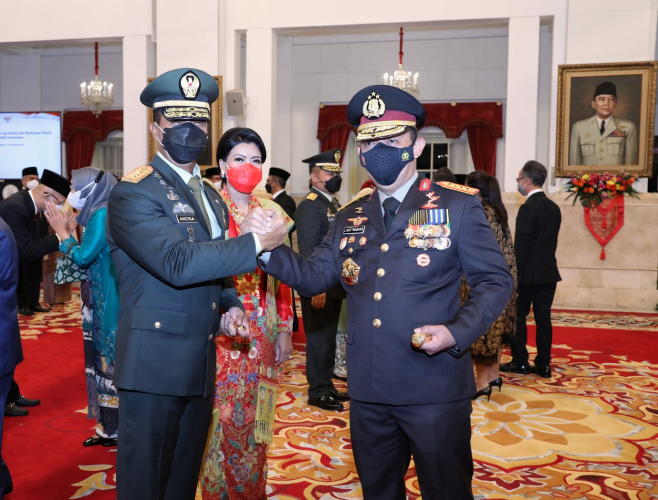 Kapolri Jenderal Listyo Sigit Prabowo menyampaikan ucapan selamat kepada Jenderal TNI Andika Perkasa yang telah resmi dilantik sebagai Panglima TNI.