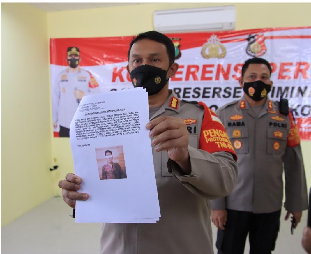 “Diamankan anggota kemarin sore di kediaman yang bersangkutan, saat ini pelaku sudah kita amankan di Polres metro Bekasi kota. Sudah kita lakukan penyelidikan awal dan dilakukan observasi,” kata Kapolres Metro Bekasi Kota Kombes Pol Aloysius Suprijadi saat menyampaikan keterangan pers di Mapolres, Sabtu (27/11/21)
