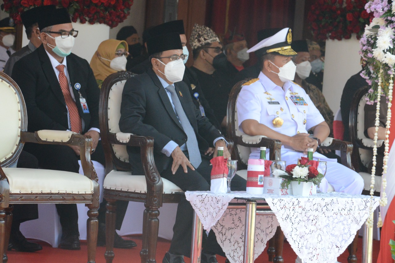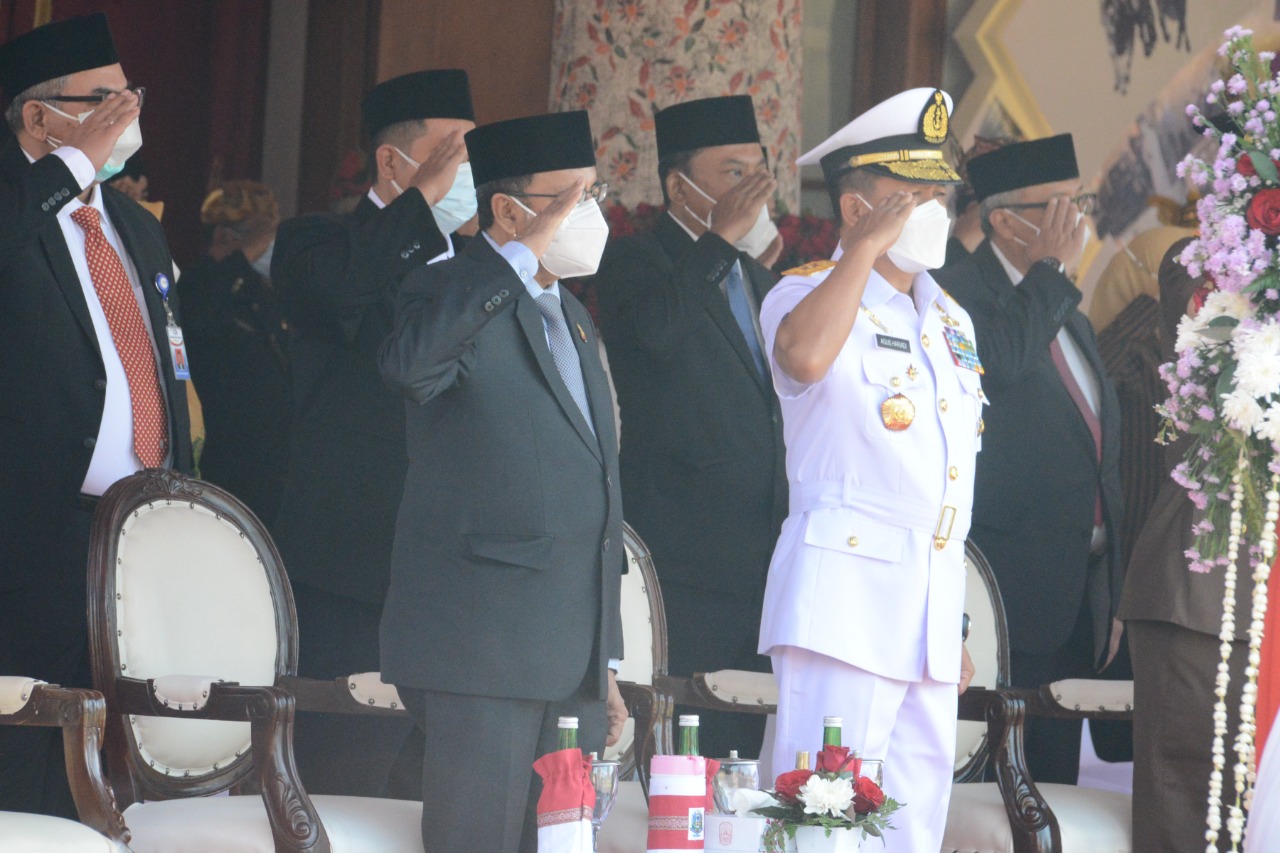 Wakil Komandan Komando Pembinaan Doktril Pendidikan dan Latihan TNI AL (Wadan Kodiklatal) Laksamana Muda TNI Agus Hariadi menghadiri upacara Peringatan HUT Provinsi Jawa Timur yang ke-76 yang dilaksanakan di halaman Gedung Negara Grahadi, Rabu (13/10/2021).