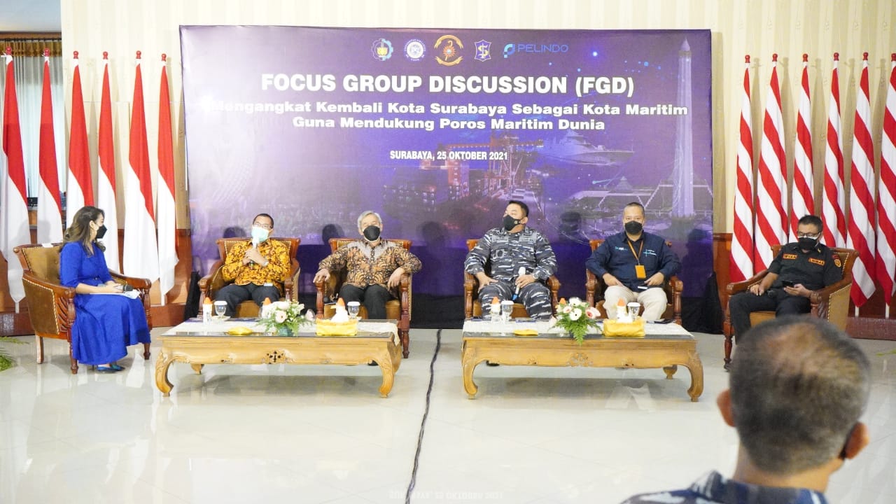 FGD dengan Keynote Speaker Dankodiklatal Laksamana Madya TNI Nurhidayat yang diwakili Wadan Kodiklatal Laksamana Muda TNI Agus Hariadi ini, juga menghadirkan beberapa nara sumber Walikota Surabaya yang diwakili BPB Linmas Surabaya Irvan Widyanto, Head Regional III PT. Pelindo, Prof. Dr.Purnawan, S.S., M.Hum. (Ahli Sejarah Surabaya), Prof. Ir. R. Syarif Widjaya , Ph.D., FRINA. (Pakar Ilmu Maritim) serta moderator Fanny Patricia (Penyiar JTV).