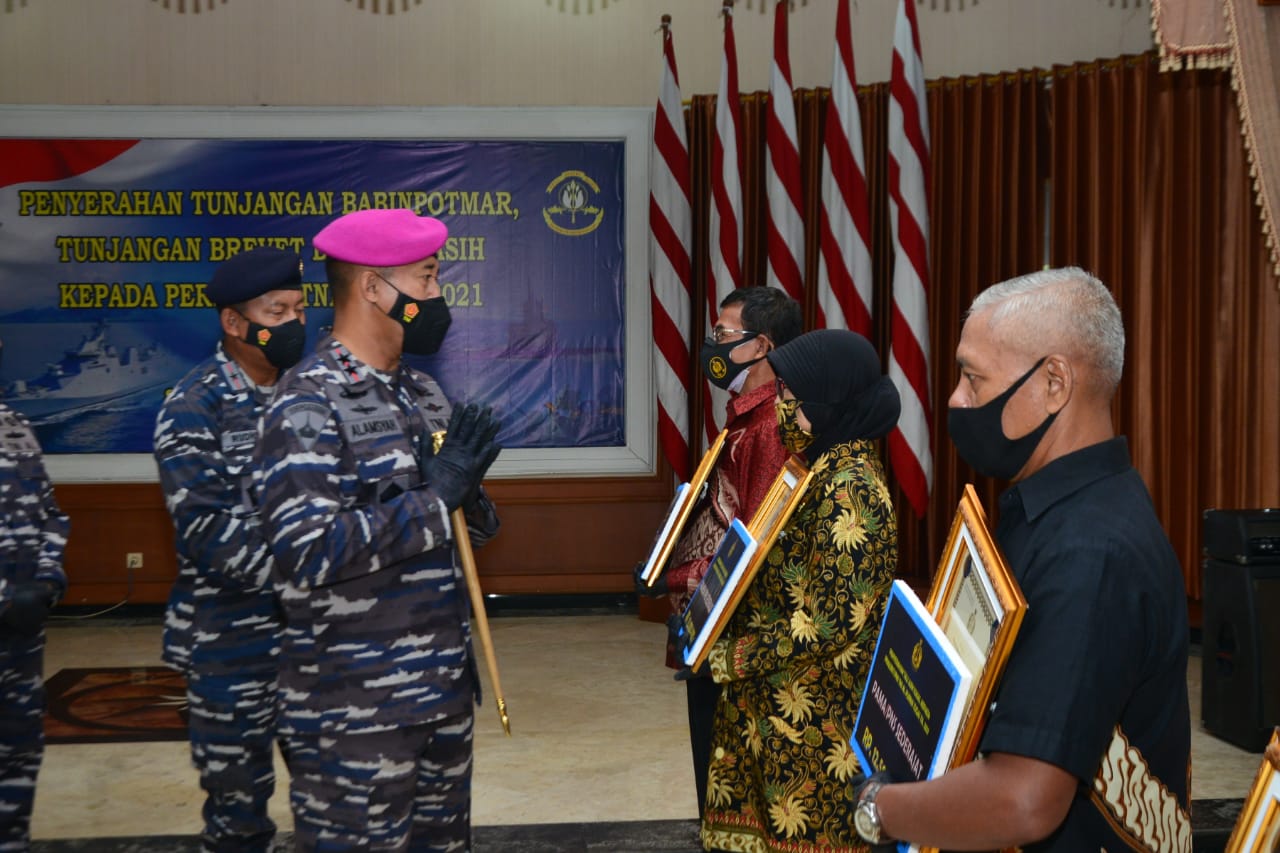 “Dalam kesempatan ini telah didistribusikan tunjangan Babinpotmar kepada 727 personel, tunjangan brevet (kemampuan khusus) kepada 5.637 personel, serta tali asih untuk prajurit/PNS TNI AL yang akan memasuki masa purna tugas sebanyak 1.274 personel.