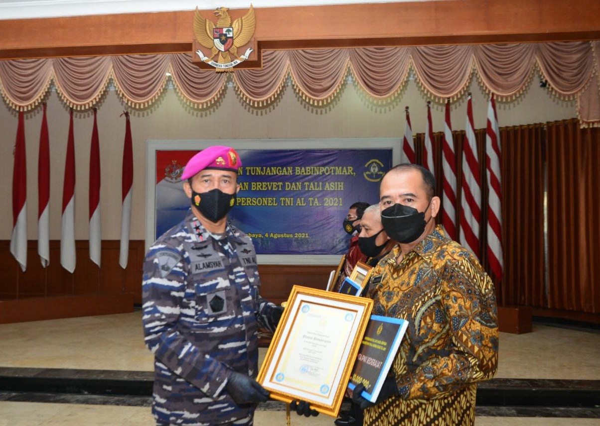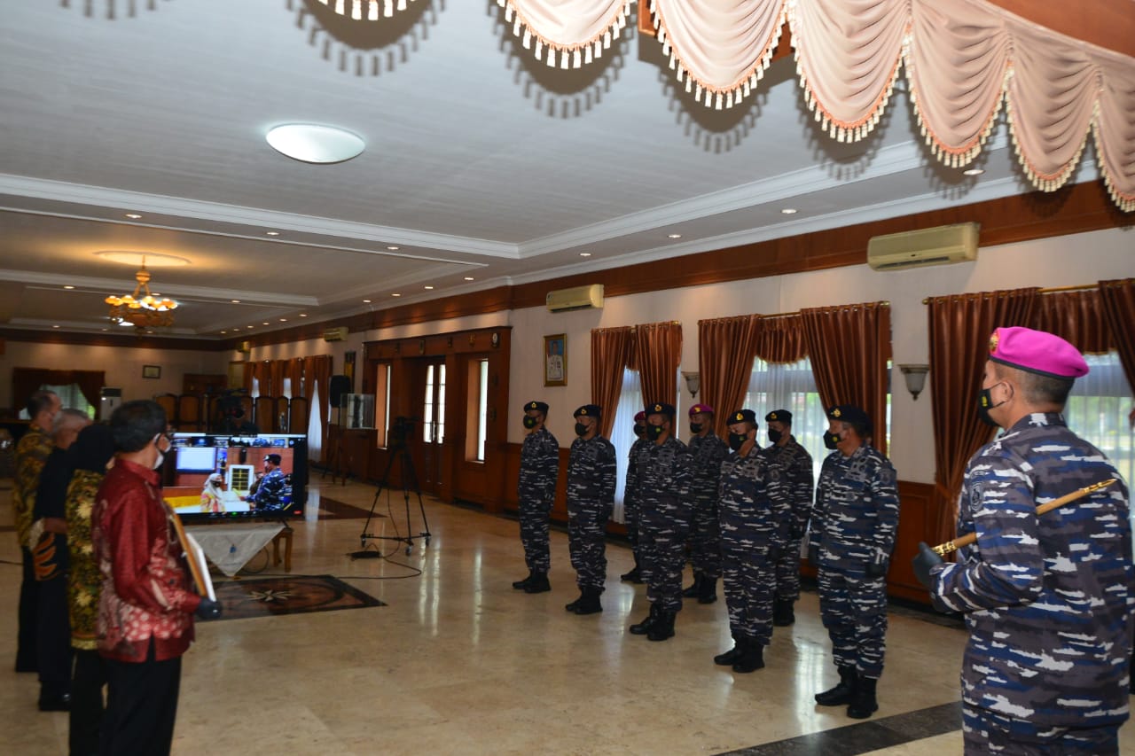 Gubernur Akademi TNI Angkatan Laut (AAL), Mayor Jenderal TNI (Mar) Nur Alamsyah, S.E., M.M., M.Tr (Han) mengikuti acara Penyerahan Tunjangan Babinpotmar, Brevet, dan Tali Asih kepada Prajurit TNI AL secara daring dan mewakili Kepala Staf TNI Angkatan Laut (Kasal), Laksamana TNI Yudo Margono, S.E., M.M. menyerahkan tali asih kepada 16 personel AAL di Gedung Dewakang, Kesatrian AAL, Bumimoro, Surabaya, Rabu (4/8).
