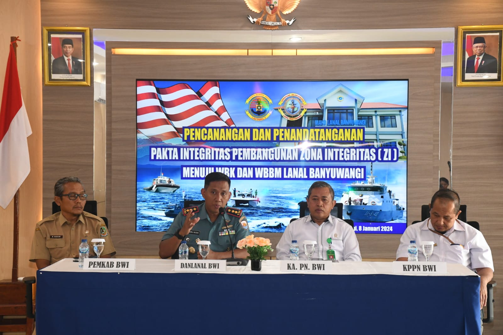Dalam rangka mewujudkan Pangkalan TNI AL (Lanal) Banyuwangi sebagai Wilayah Bebas dari Korupsi, Danlanal Banyuwangi Letkol Laut (P) Indra Nusha R, melaksanakan Pencanangan Pembangunan Zona Integritas (ZI) dan Reformasi Birokrasi (RB), yang dilaksanakan di Aula Wisma Bahari Mako Lanal Banyuwangi Jl. Raya Situbondo No. 54 Ketapang Banyuwangi. Senin (08/01/2024).